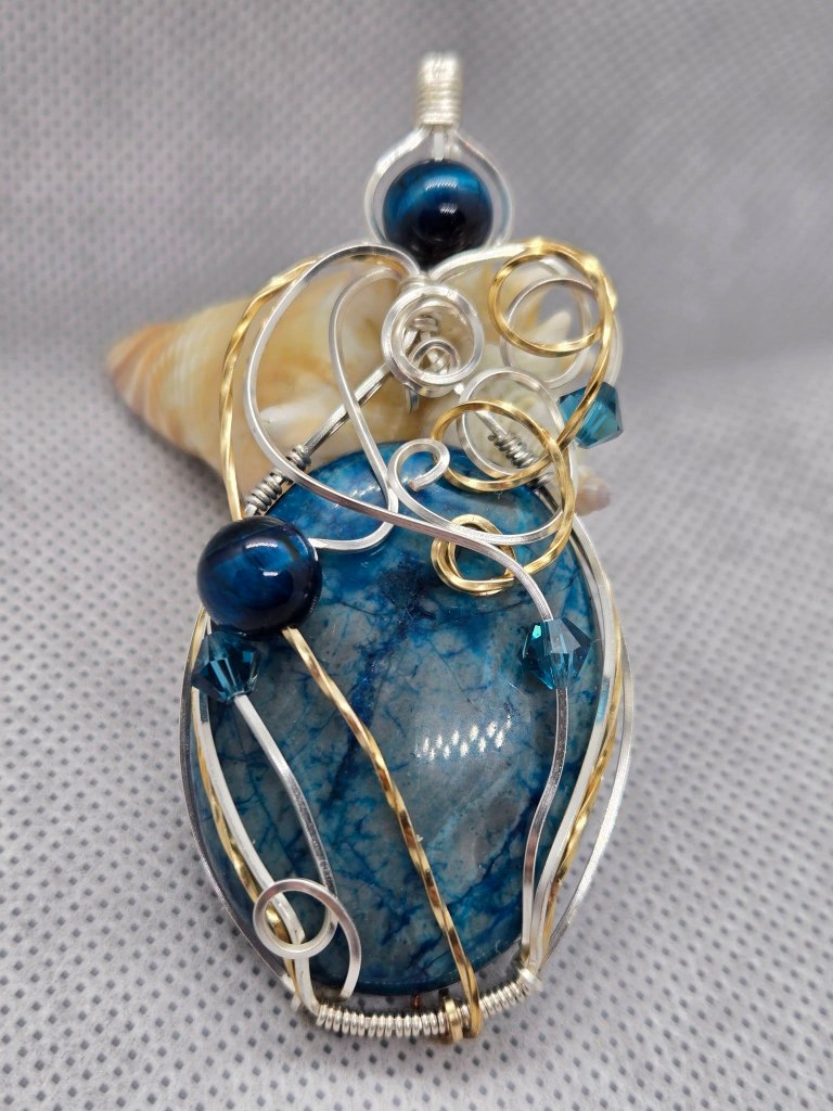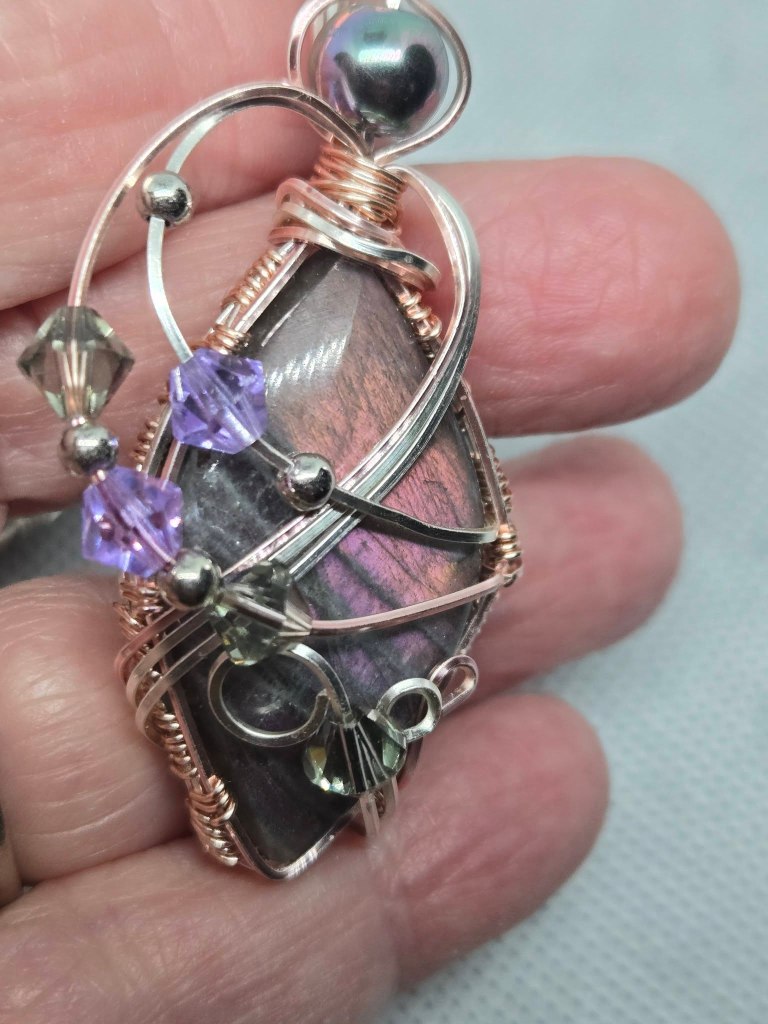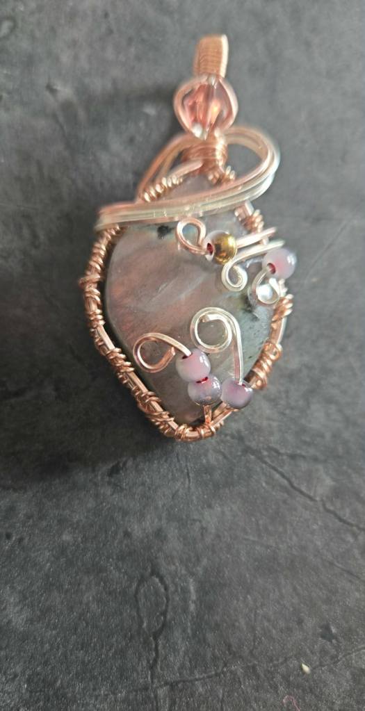 I love the large variety of brilliant colours and textures of the glass. Chris taught me the fusing process and the wrapping began. I have wrapped for about 7 years now. I do melt my own pendant and earring pieces, but also have branched out to the wrapping of stone/minerals as their colours are also so unique and variable.