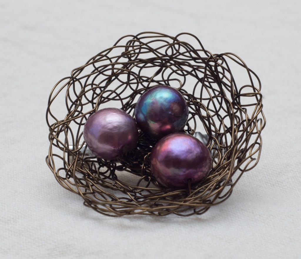Viewers of Kat’s work instinctively exclaim, “It’s so pretty!” Her necklaces, brooches (including her unique nest brooch!), pins, and earrings range from casual/funky, to statement pieces, to special-occasion jewelry for weddings and other celebrations. All her pieces have one thing in common – they feature minerals and gemstones. Kat has a life-long fascination with “pretty rocks”, and her pretty, wearable and unique designs are inspired by their colour, shape and sheen.