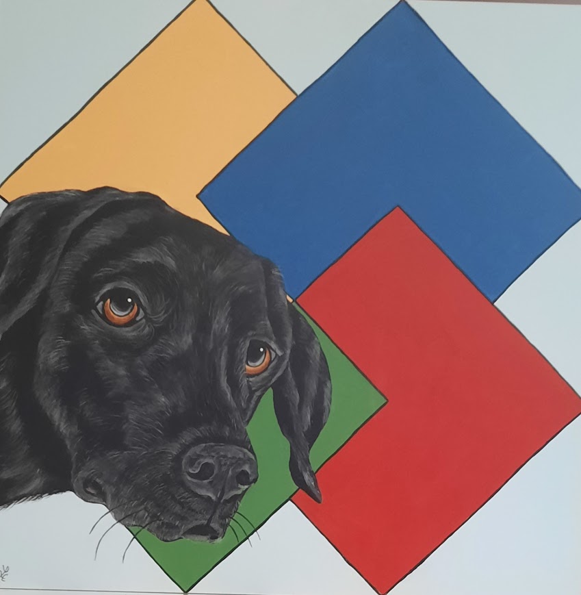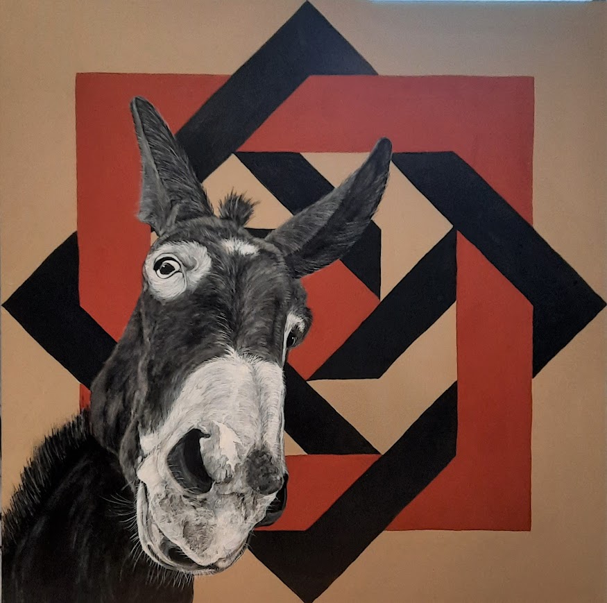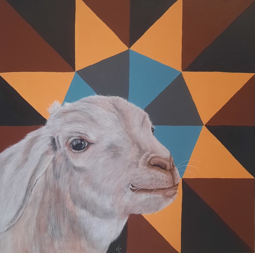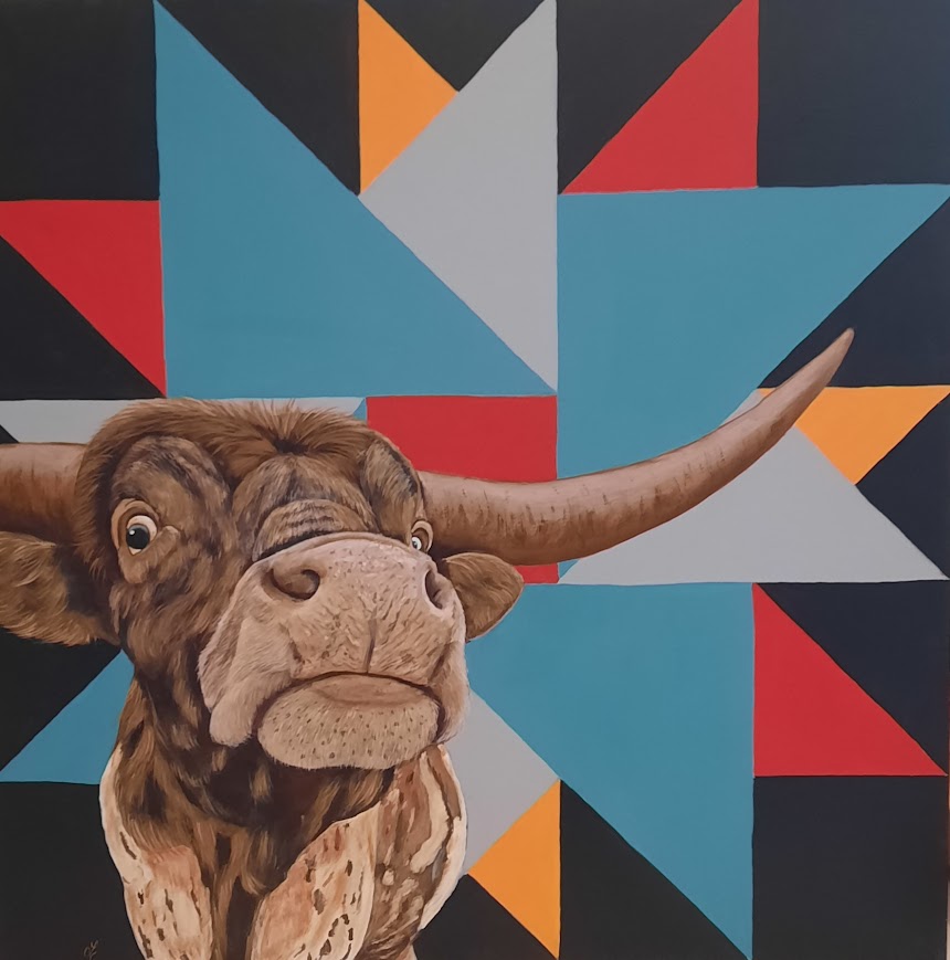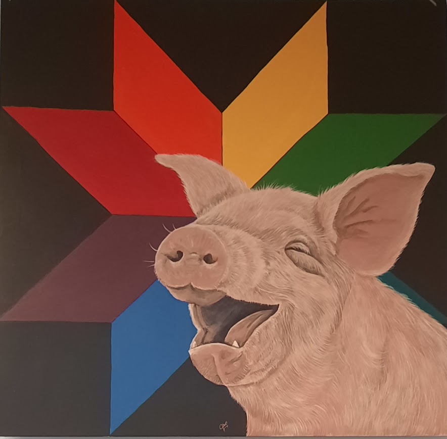 But I have incorporated my love of animal portraiture and have been creating a series that I call “Photo-bombing Barn Quilts”. They are painted on lightweight aluminum panels with high quality exterior house paint. I have been able to achieve the same fine definition of the animals as I have done in the past for my interior animal portraiture.The barn quilts can be mounted on fences, garages, sheds and more and even on barns!